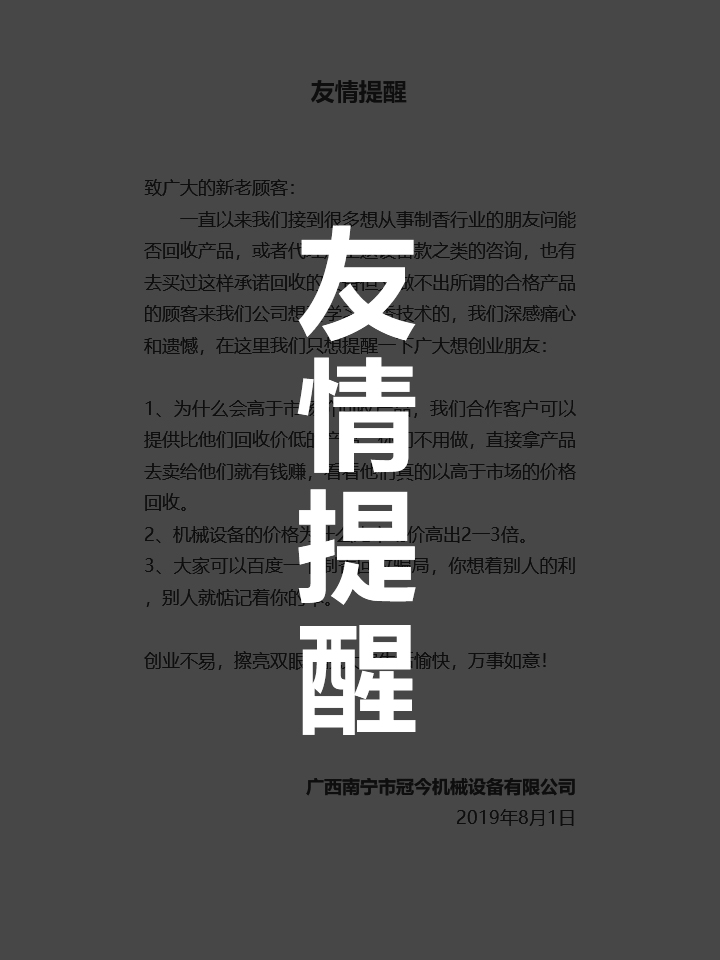 購買冠今制香機,享受八大保證,讓您創(chuàng)業無憂!冠今制香機八大支持保證系統:強力支持 后顧無憂 1.現場觀摩:免費在制香廠里參觀各種香生產流程,滿意后再做決定。 2.專業培訓:購制香機...